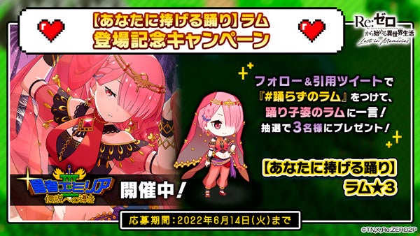 内容:『リゼロス』公式Twitter(https://twitter.com/re_zero_rezelos)をフォローして、キャンペーンツイートを引用&ハッシュタグ「#踊らずのラム」をつけて、踊り子姿のラムへの一言を投稿すると、「【あなたに捧げる踊り】ラム★3」を抽選で3名様にプレゼントするキャンペーンを開催します。