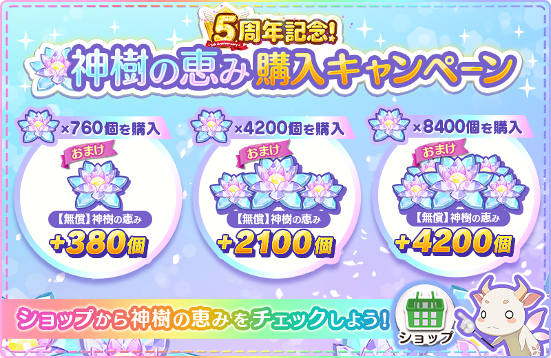 期間中、ショップに「神樹の恵み(無償)」のおまけ付き「神樹の恵み(有償)」のアイテムが追加されます。ぜひショップをチェックしてみてくださいね。