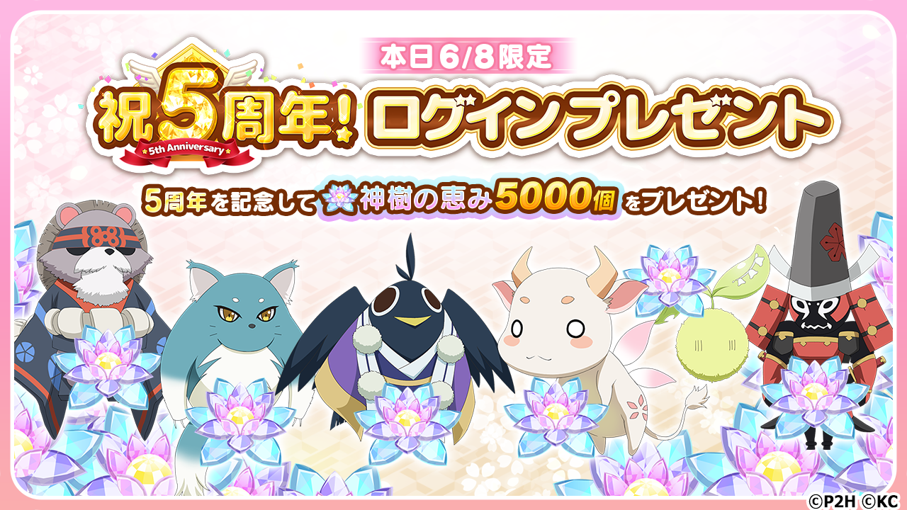 更に、5周年当日の2022年6月8日(水)0:00〜 23:59にログインすると、なんと!「神樹の恵み5,000個」をプレゼント!!この機会を是非お見逃しなく!!