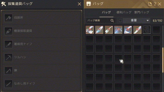 採集道具バッグには、各採集道具を1点ずつ入れることができます。道具が入った採集道具バッグを着用すると、F5、F6、マウスホイールで各種採集の相互作用を便利に行うことができます。