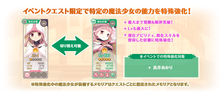 対象の魔法少女を編成して本イベントクエストをプレイする際にステータスを特殊な状態に強化することができます。