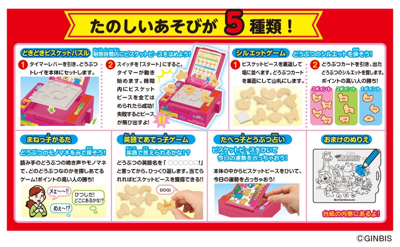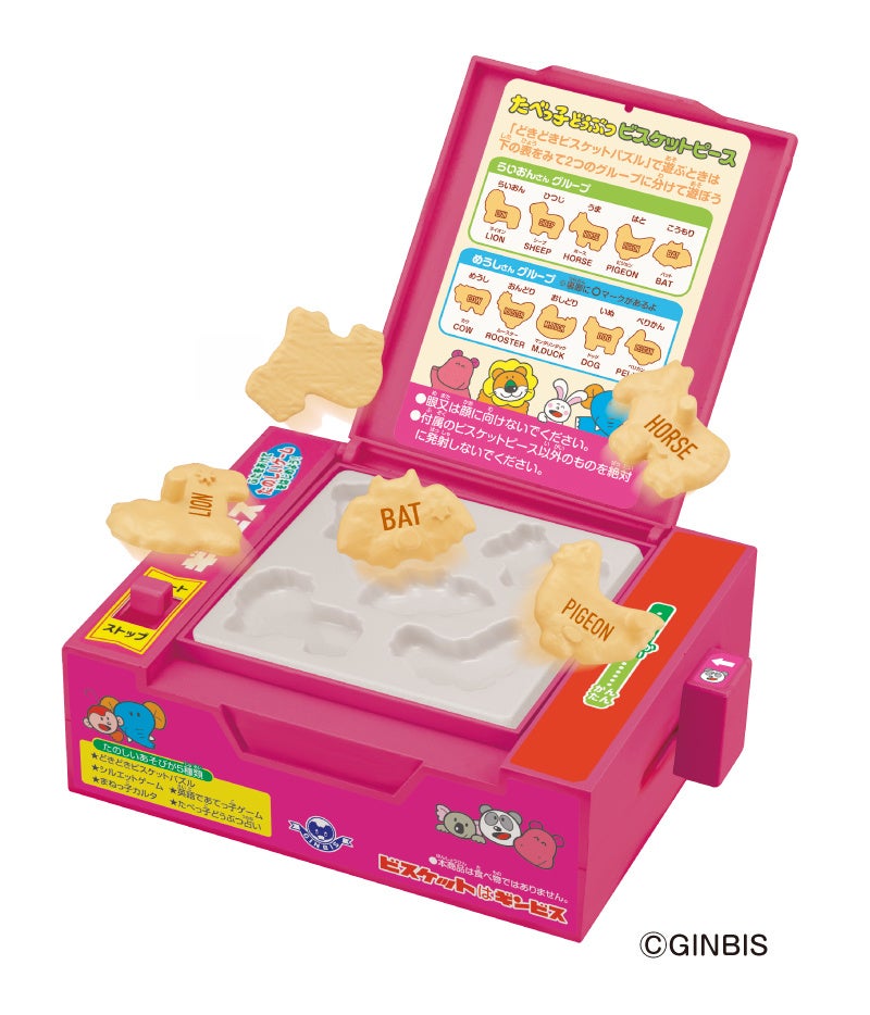 本物そっくりの本体と、かわいいビスケットピースで遊ぶ、どきどきパズルです。制限時間内に、正しいビスケットピースを、どうぶつトレイにはめていき、タイムオーバーになると、ピースがガシャン!と飛び出します。難易度は「かんたん」「むずかしい」を選択でき、小さなお子さまから大人まで楽しく遊べます。その他全部で5つのゲームも楽しむ事ができ、ビスケットピースを使ったシルエットゲーム、英語が学べるゲーム等があります。