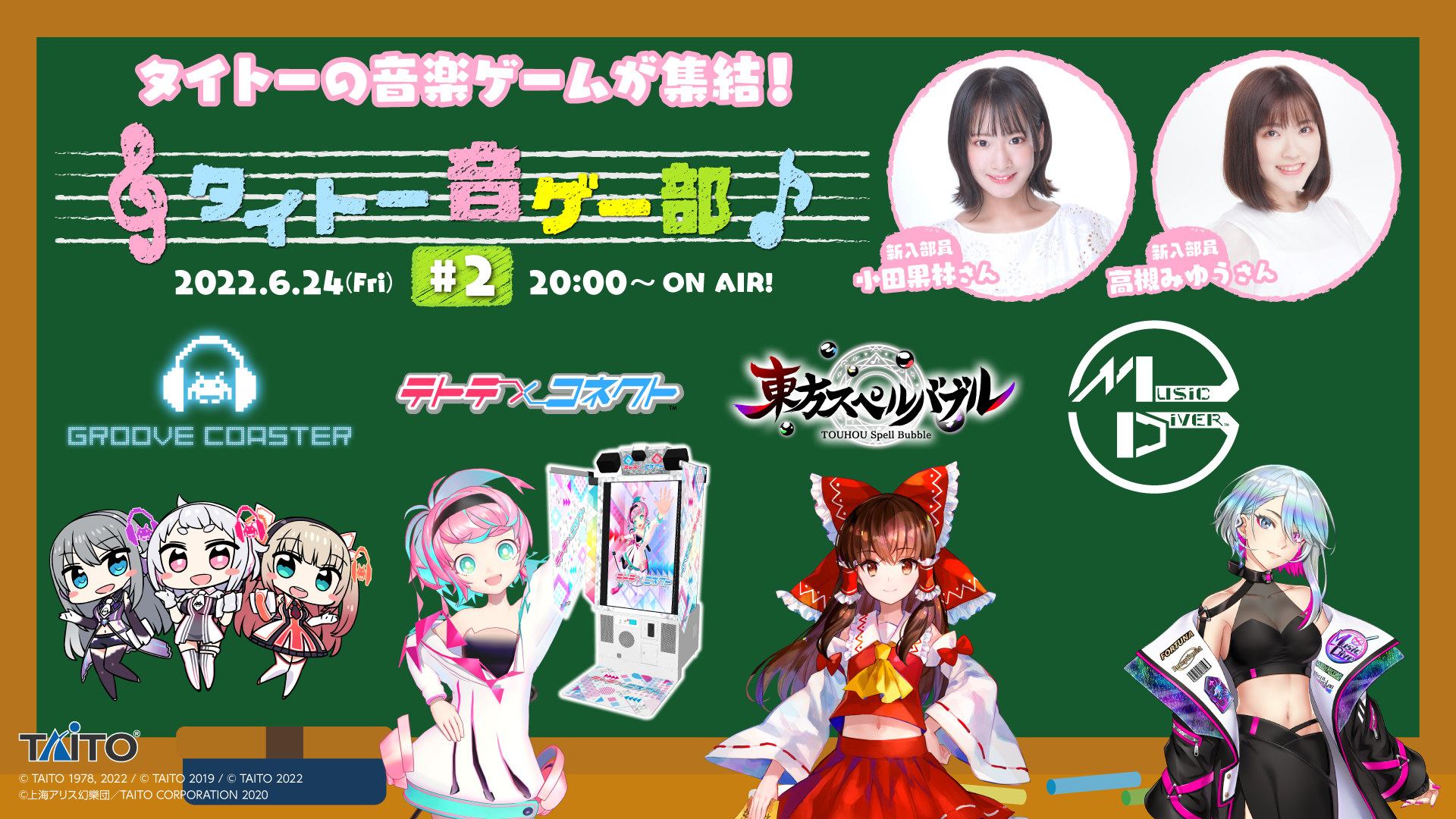 株式会社タイトー(本社:東京都新宿区、以下タイトー)は、タイトーの音楽ゲーム4タイトル『グルーヴコースター』、『東方スペルバブル』、『テトテコネクト』、『MUSIC DIVER』の合同LIVE配信番組「タイトー音ゲー部」の第2回を2022年6月24日(金)20時からYouTube LIVEで生配信いたします。第2回目となる今回の配信では、『テトテコネクト』特集と銘打って、先出し情報の発表や最新曲のゲームプレイ、『東方スペルバブル』パートではお客様とのオンライン対戦、『グルーヴコースター』、『MUSIC DIVER』の最新情報などお届けしてまいります。