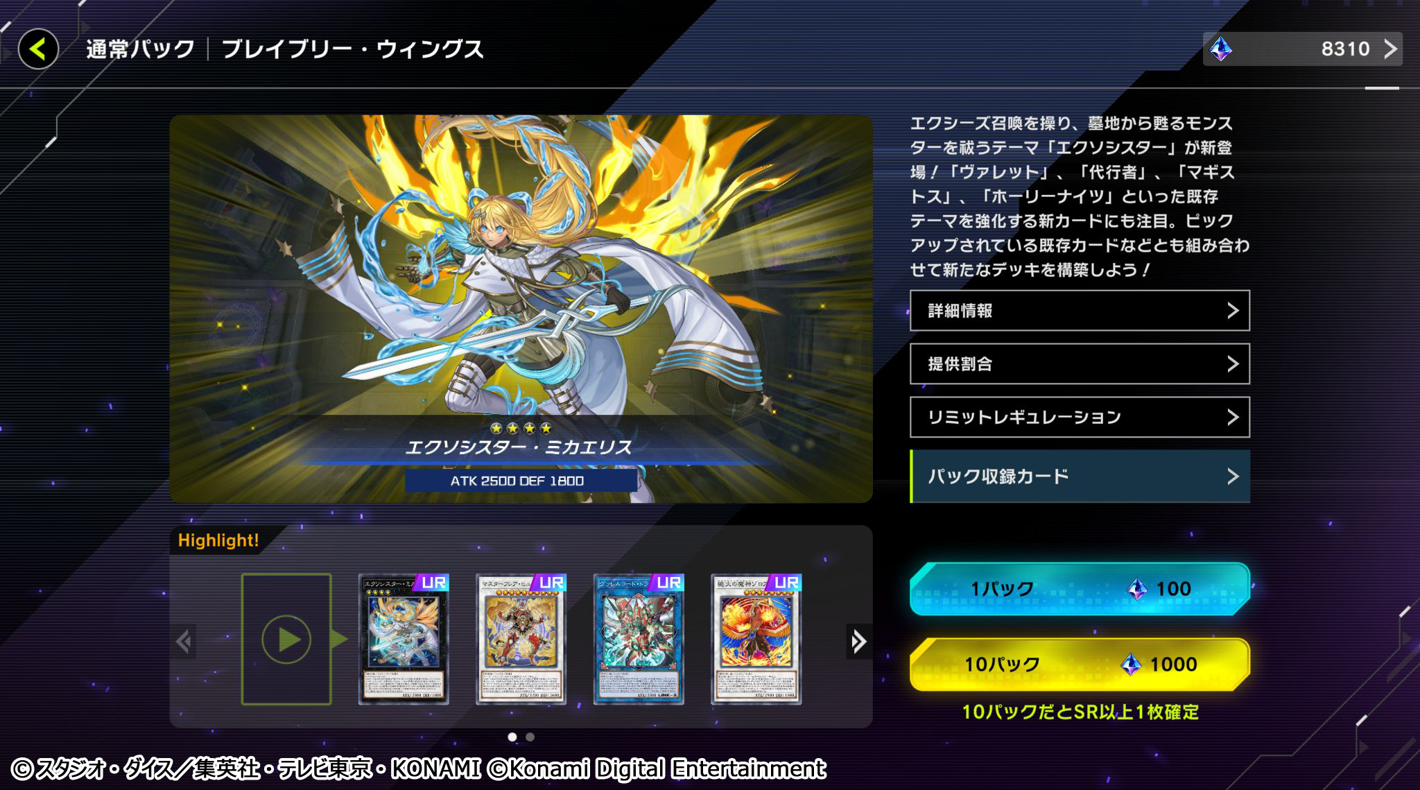 セレクションパック「ブレイブリー・ウィングス」では、エクシーズ召喚を操り、墓地から甦るモンスターを祓うテーマ「エクソシスター」が新登場。「エクソシスター・ミカエリス」や「マスターフレア・ヒュペリオン」、 「ヴァレルコード・ドラゴン」、「絶火の魔神ゾロア」など、UR・SRカード19種を含む新規カード40種などがランダムに封入されています。