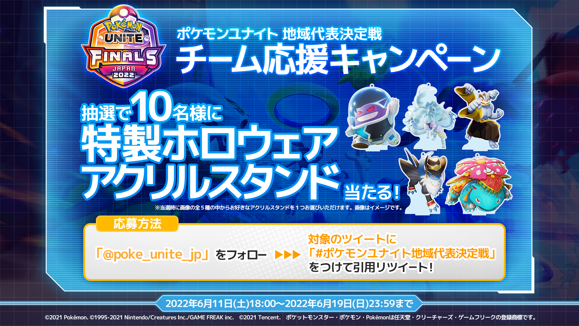 | 関連キャンペーン | ●チーム応援キャンペーン 「ポケモンユナイト公式」Twitterアカウントをフォロー・対象のツイートを引用RTし、#ポケモンユナイト地域代表決定戦 をつけて応援メッセージを投稿してください。 抽選で10名様に「ホロウェアアクリルスタンド」をプレゼントします。 ※「ホロウェアアクリルスタンド」はフシギバナ(サンシャインスタイル)・アブソル(ダークスーツスタイル)・ゲンガー(うちゅうスタイル)・アローラキュウコン(しんせいスタイル)・カイリキー(たつじんスタイル)の中から1つお好きな種類をお選びいただけます。 |