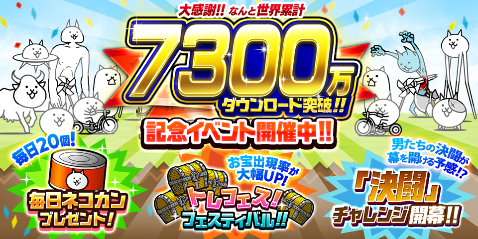 ポノス株式会社(本社:京都府京都市、代表取締役:辻子依旦、以下「ポノス」)が提供するスマートフォン向けゲームアプリ「にゃんこ大戦争」がシリーズ累計7300万ダウンロードを突破いたしました。これを記念して、期間限定記念イベントを2022年6月13日(月)11:00より開始いたしましたので、これをお知らせいたします。