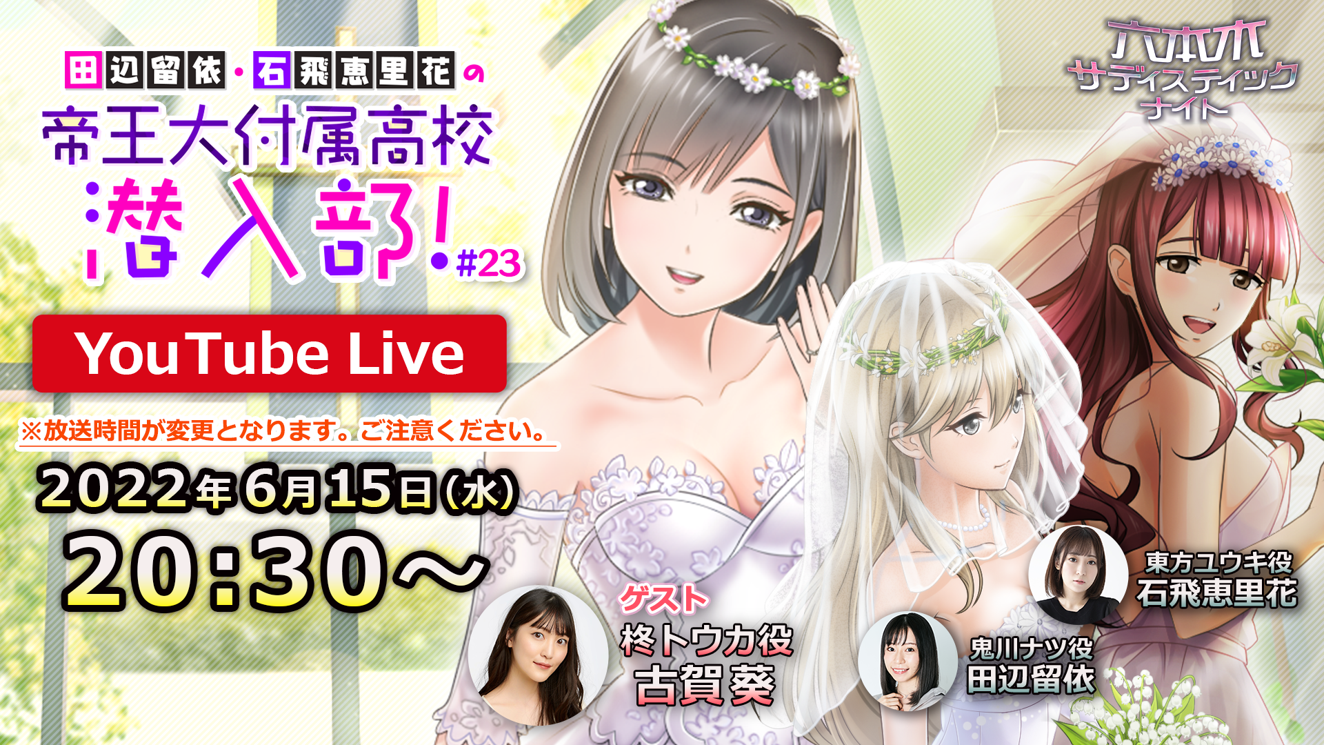本番組メインパーソナリティである鬼川ナツ役の田辺留依さんと、東方ユウキ役の石飛恵里花さんのほか、ゲストに柊トウカ役の古賀葵さんをお招きし、「六本木サディスティックナイト」に関するトークや企画をお届けいたします。