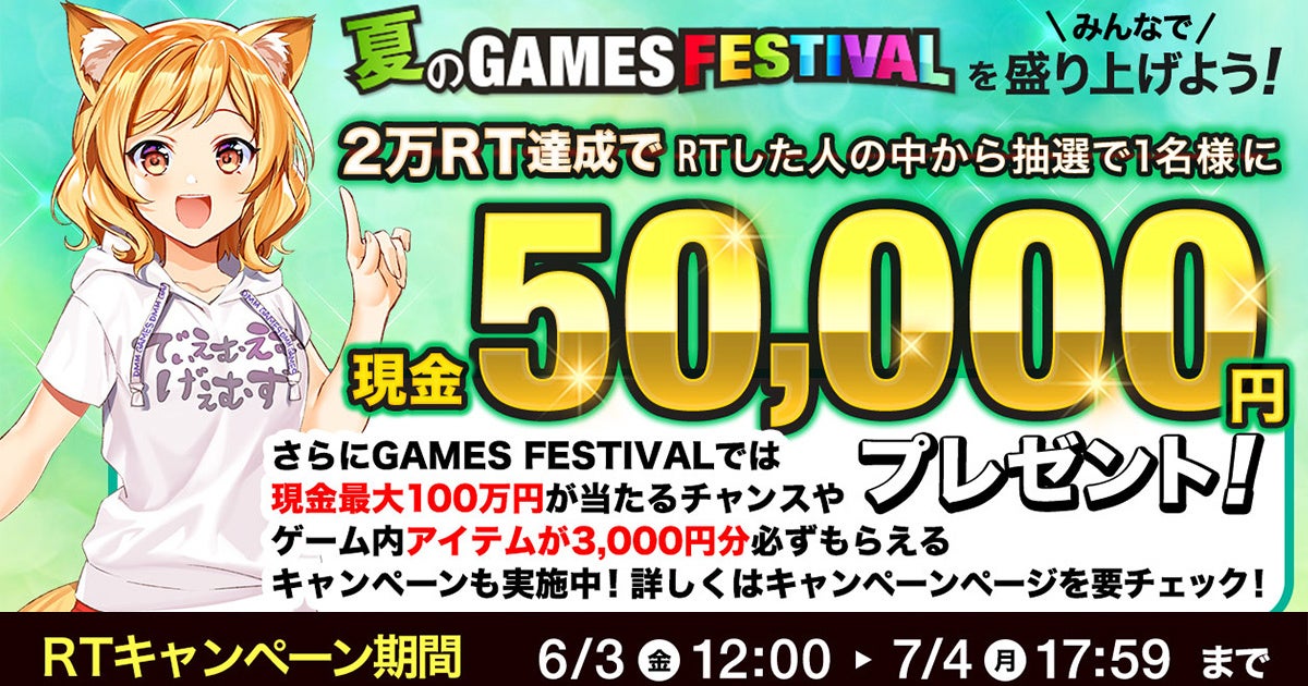 合同会社EXNOA(本社:東京都港区、CEO:村中 悠介、URL:https://games.dmm.com/)が運営するDMM GAMESは、現金50,000円が抽選で1名様に当たる「夏のGAMES FESTIVALをみんなで盛り上げよう!」RTキャンペーンを開催中です。