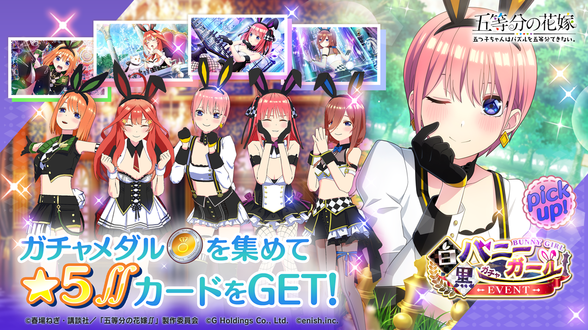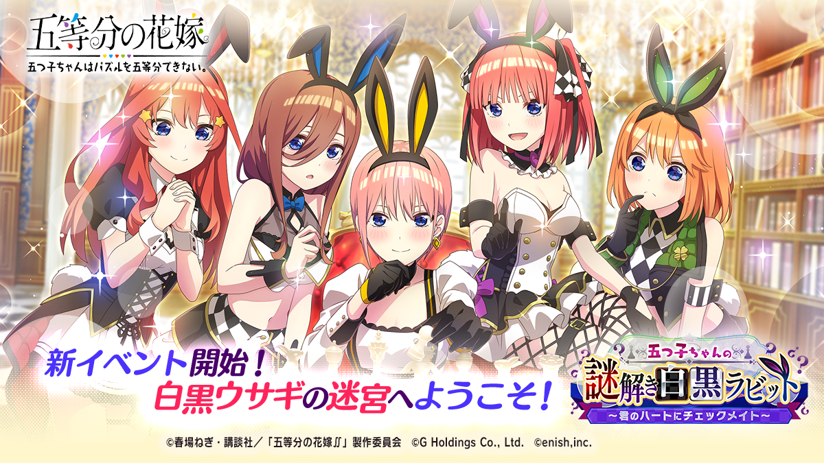 株式会社enish(本社:東京都港区、代表取締役社長:安徳 孝平、以下enish)は、2022年6月17日(金)より、アニメ「五等分の花嫁」初となるゲームアプリ『五等分の花嫁 五つ子ちゃんはパズルを五等分できない。』にて、週刊少年マガジン編集部完全監修のゲームオリジナルストーリーをフルボイスでお楽しみいただける新イベント「五つ子ちゃんの謎解き白黒ラビット ~君のハートにチェックメイト~」を開催いたします。