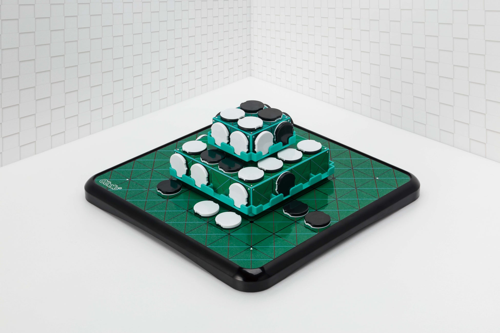 ルールはオセロと同様に「はさんでひっくり返すだけ」。立体盤ならではの斜めの石もひっくり返しやすいようにガイドラインが付いています。