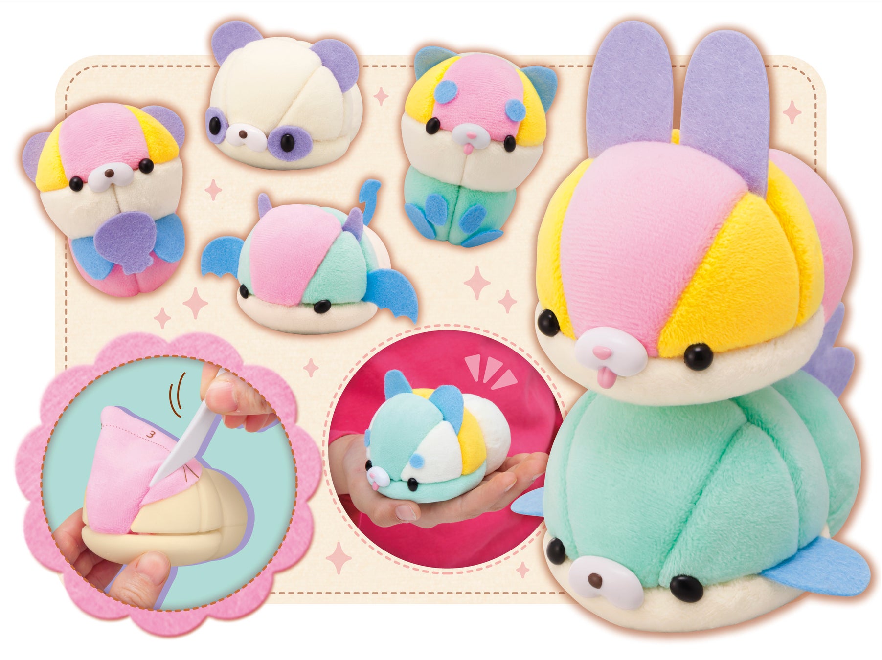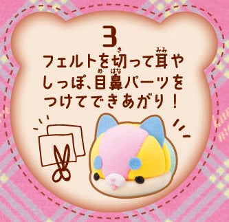 くるまーるは、付属の布やフェルトを本体にスティックで押し込み、目や鼻のパーツをさしたら可愛いマスコットが簡単に出来上がります。材料は市販の布やフェルト、ご家庭にある布も代用が可能です。また、針と糸を使わずに安全に何度でも繰り返し遊ぶことができます。
