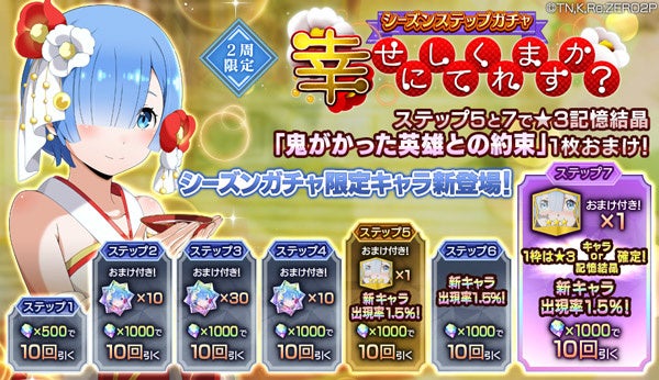 ステップ1では「魔法石500個」で10回ガチャを引くことができ、ステップ2・3・4では「【幸せにしてくれますか?】のかけら」、ステップ5・6・7ではピックアップキャラの出現率が1.5%、ステップ5では記憶結晶「鬼がかった英雄との約束★3」のおまけ付き、ステップ7では10連中★3キャラもしくは★3記憶結晶が1枠確定&記憶結晶「鬼がかった英雄との約束★3」のおまけ付きのお得なガチャです。