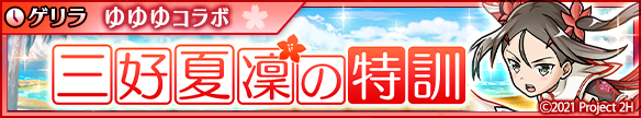 クエスト「勇者部訓練」、「三好夏凜の特訓」を開催。クエストをクリアすると、コラボ限定装備と交換できるアイテム「満開の花びら」と名声ポイントが獲得できます。名声ポイントのランキング報酬として「[満開]東郷美森」」の召喚書が獲得できます。