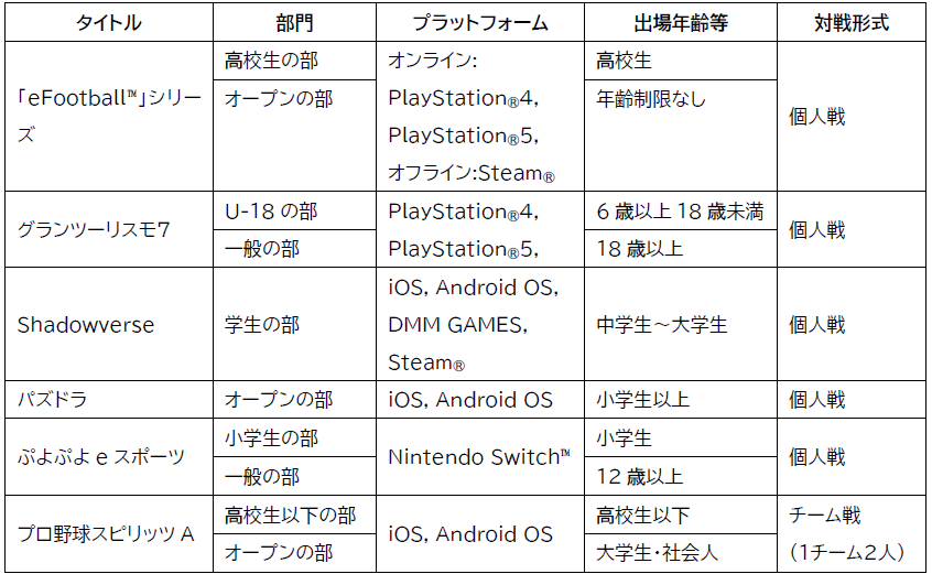 ※「eFootball™」については、大会予選~本戦期間中にソフト更新の可能性があるため「シリーズ」表記としています。 「PlayStation」および「グランツーリスモ」は、株式会社ソニー・インタラクティブエンタテインメントの商標または登録商標です。 DMMは、合同会社DMM.comの登録商標です。 Steamは、米国及びその他の国のValve Corporationの商標または登録商標です。 Nintendo Switchは任天堂の商標です。