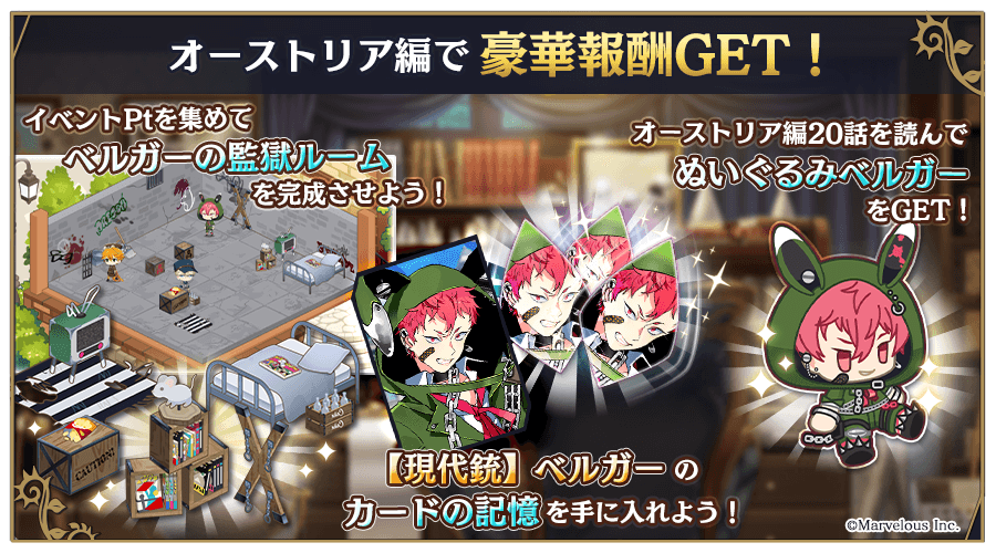 株式会社マーベラス(代表取締役社長 許田周一/所在地:東京都品川区)による、スマートフォンゲーム『千銃士:Rhodoknight』(読み:せんじゅうし ろーどないと 以降、『千銃士R』)は、本日より本編であるロードストーリー「オーストリア編」の配信を開始しました。また、本編並走イベントクエスト「ベルガーを監獄に収監!?」を開催いたします。イベント報酬に「監獄ルーム」を作ることができるイベント限定家具が報酬に登場します。イベントクエストにあわせて、イベント内で活躍する★3「ベルガー(CV:豊永利行)」の新カードがピックアップで登場する期間限定ガチャを開催いたします。