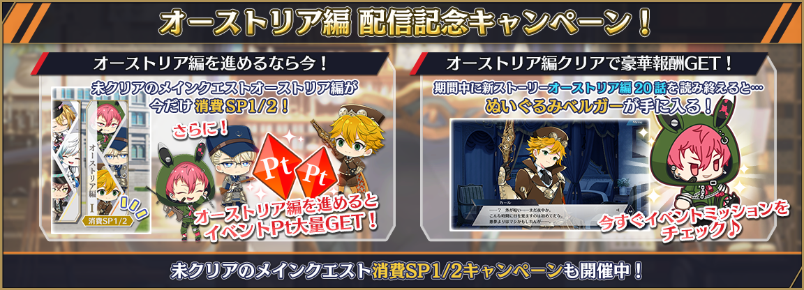 ロードストーリーオーストリア編の追加を記念して、オーストリア編読了を応援する期間限定のキャンペーンを開催中です! キャンペーンでは期間中メインクエストの消費SPが1/2になり、ストーリーをクリアすると「ぬいぐるみベルガー」を獲得する事が出来ます!是非この機会にストーリーを進めてくださいね♪詳しくはゲーム内のお知らせをご覧ください。
