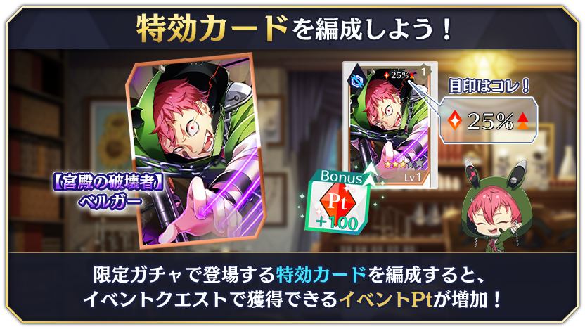 クエストで獲得できるイベントPt(ポイント)が増加したり、エリートクエストで効果を発揮する「イベント特効カード」で有利にイベントを進めましょう♪