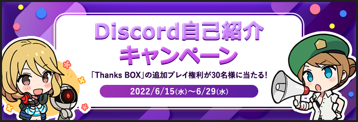 AVA公式Discordサーバーの「自己紹介」チャンネルで投稿をすると、「Thanks BOX」を追加でプレイできる権利が30名様に当たるキャンペーンを開催いたしました。強力な永久銃器を追加で獲得できるチャンスになりますので、この機会に是非公式Discordサーバーを利用してみてください。