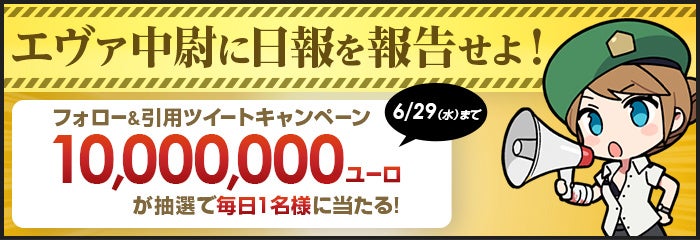 「AVAれ放題祭」開催を記念して、期間中に「合成システム」で合成した銃器をTwitterに投稿すると、毎日抽選で1名様に10,000,000ユーロ(ゲーム内通貨)が当たるキャンペーンを開催。大量の銃器が貰えるこの機会だからこそ、いろいろな銃器合成を試して、是非Twitterに投稿してご参加ください。