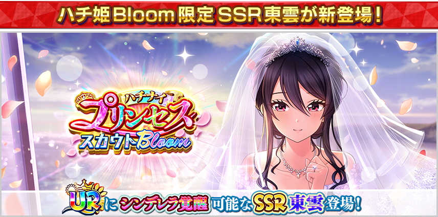 期間中、ログインで最大150連スカウトに挑戦できるスカウトチケットをプレゼント中です。また、ハチナイプリンセススカウトBloomにて、URにシンデレラ覚醒可能なSSR東雲龍(CV. 近藤玲奈)が新登場いたします。