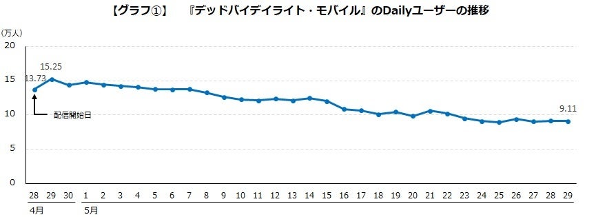 配信開始日である4月28日は13.73万人、集計期間内で最もDAUが多かったのは2日目の4月29日で15.25万人を記録しました。その後徐々に減少し、5月末には9万人レベルで安定し推移しています。【グラフ①】
