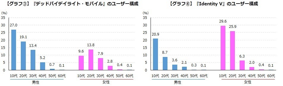 一方、『Identity V』のユーザー構成を見ると、『デッドバイデイライト・モバイル』とは正反対で、女性ユーザーが64.2%を占めています。最も割合が高い10代女性の29.6%と、20代女性の25.9%が突出しており、10~20代女性だけで55.5%と過半数を占めています。【グラフ④】