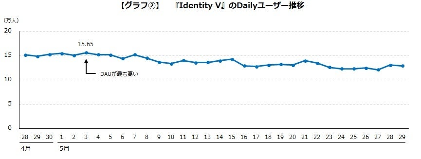 サービス開始から4年を経た『Identity V』ですが、『デッドバイデイライト・モバイル』と同じ本年4月28日以降のDAUを見てみると、13~15万人程度で推移している事がわかりました。最もDAUが多かったのは5月3日の15.65万人で、この日には4日間かけて行われた大会である「Call Of The Abyss V」の決勝が行われていました。【グラフ②】