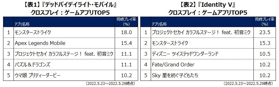 また、『デッドバイデイライト・モバイル』をプレイしているユーザーが、他にどのようなゲームをプレイしているのか調べると、若い男性中心のユーザー構成を裏付けるように、『モンスターストライク』やPCゲームが元となっている『Apex Legends Mobile』などをプレイしていることがわかりました。【表1】