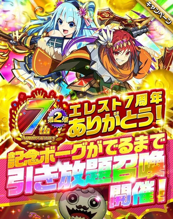 「記念ボーグが出るまで引き放題!召喚」や、毎日無料10連武器召喚、エレスト7周年を記念したパックの販売を行います。