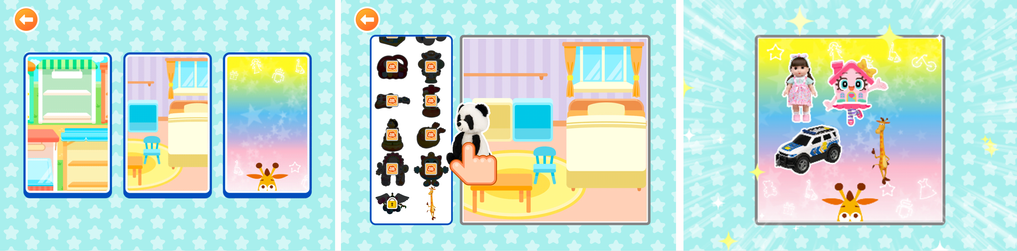 「おもちゃをあつめよう!ドリームトイラン」で集めたおもちゃを、シールとして使って遊べるゲームです。 3種の背景から選ぶことができ、全52種のおもちゃシールを自由に貼って楽しむことができます。