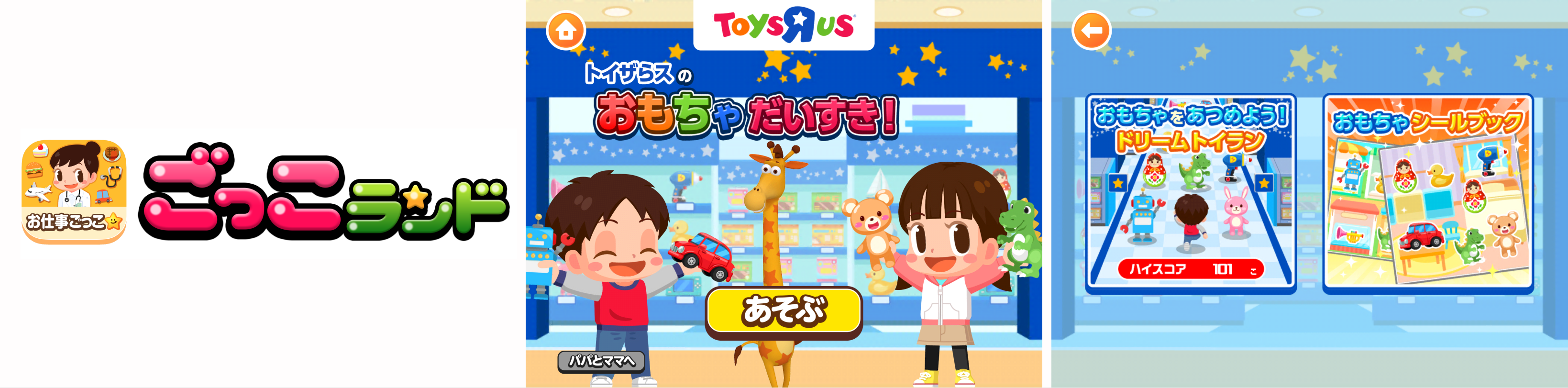 本ゲームを協賛する日本トイザらス株式会社は、子どもたちの想像力を刺激し、遊びを通して学びを育むとともに、子どもたちの成長に合わせてご家族の育児の悩みの解決をサポートしています。子どもたちが楽しく遊びながらトイザらスの店舗やそこで販売されているさまざまなおもちゃに触れ、学ぶ機会を提供したいという願いから、『ごっこランド』への出店が実現しました。