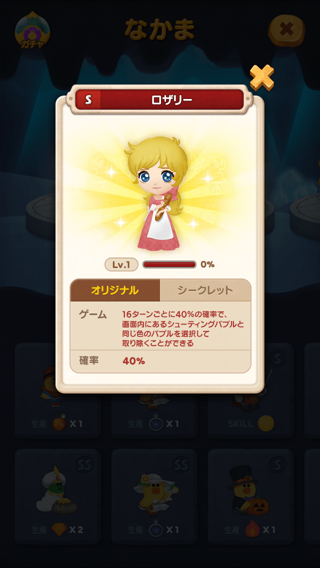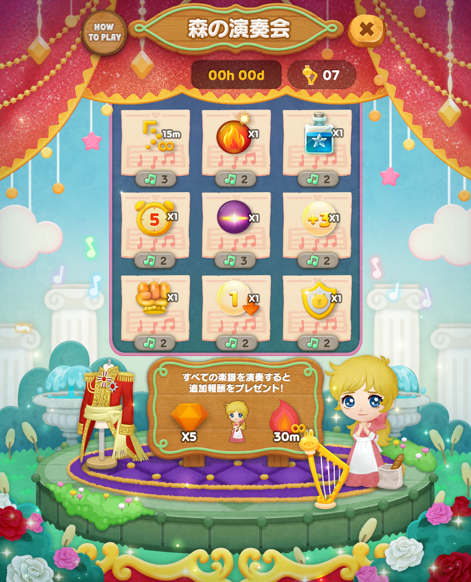 オリジナルステージをクリアすると楽器が手に入ります。手に入れた楽器を使用して楽譜の中のアイテム獲得に挑戦することができます。成功すると「ロザリー(S)」などの報酬がもらえます。