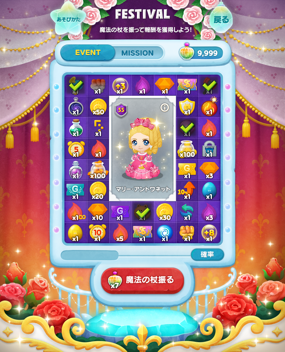 指定のミッションを達成するとマジックパウダーを手に入れることができます。マジックパウダーを使用すると報酬盤 の中からランダムで「マリー・アントワネット(SS)」やゲーム内アイテムを獲得できます。