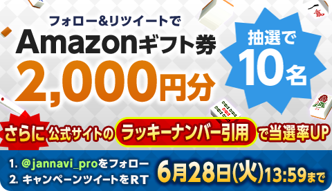 2022年6月16日(金)よりオンライン麻雀アプリ「ジャンナビ麻雀オンライン」twitter公式アカウントにて抽選でamazonギフト券2000円分を10名様にプレゼントするキャンペーンを実施いたします。