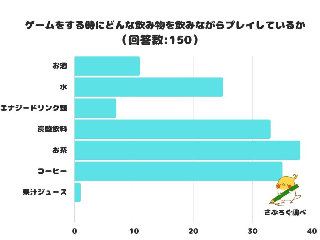 ゲームをする時にどんな飲み物を飲みながらプレイしているをアンケートにて調査したところ、1位は「お茶」でした。