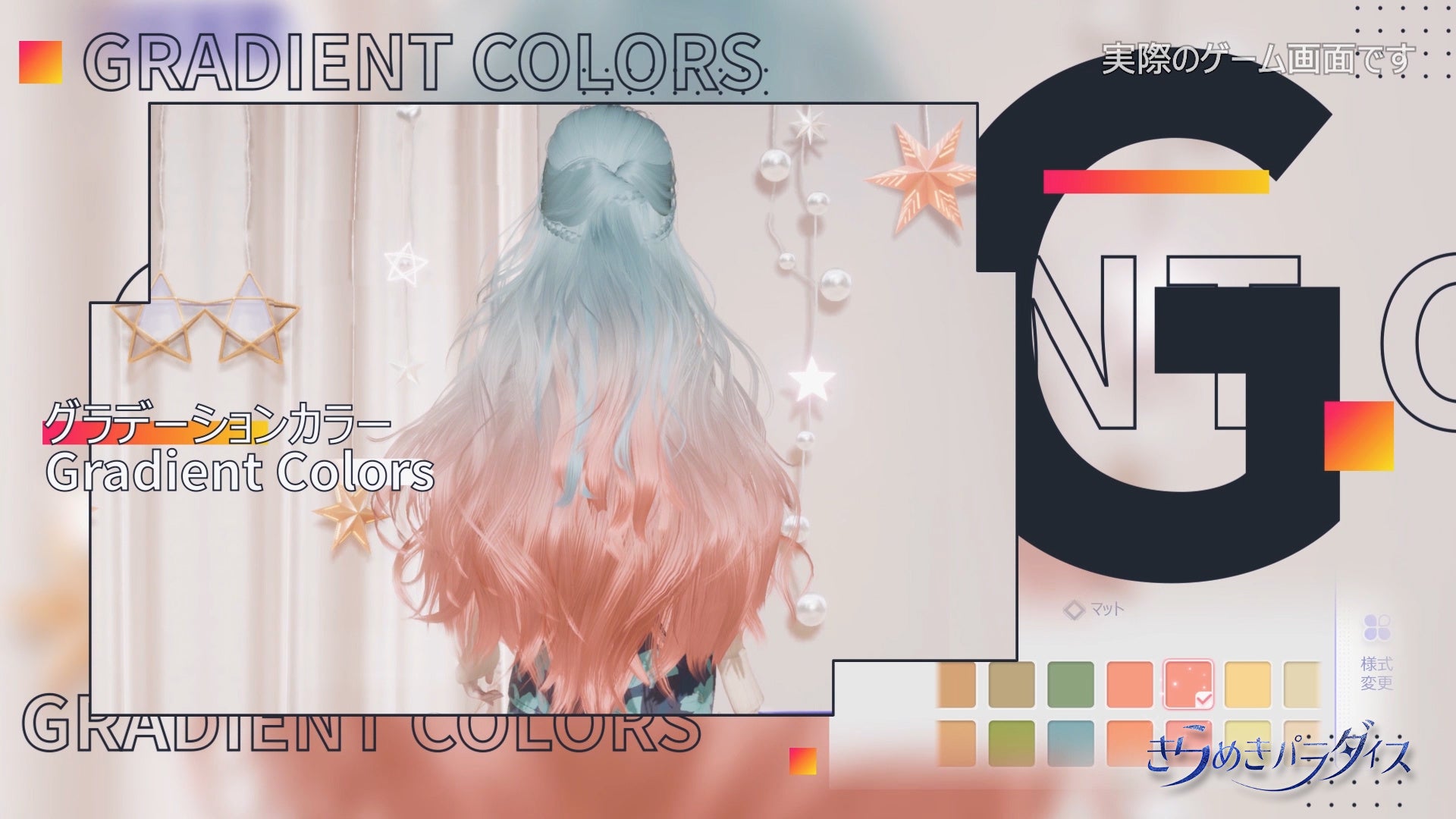 本作では髪色も単色だけでなく、グラデーションを用意しています。質感もマット・ツヤから選べ、どの色をベースにするか、毛先の色にするかも自由に選択可能です。