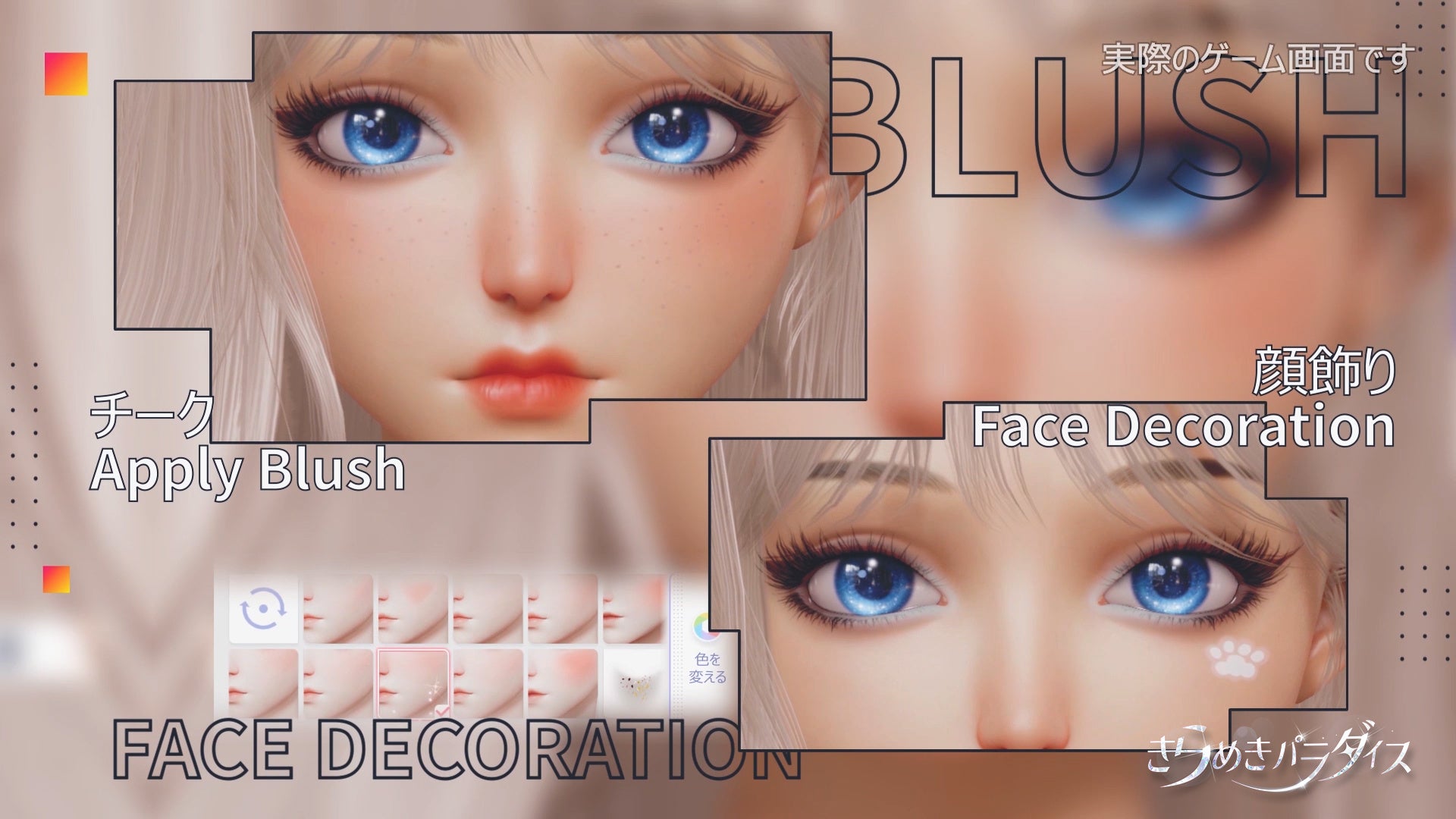 化粧では「アイメイク」「チーク」「顔飾り(デコ)」の3種がカスタマイズできます。現実では時間やお金がかかるメイクチェンジも、『きらめきパラダイス』では指先1つで簡単に変更可能です。