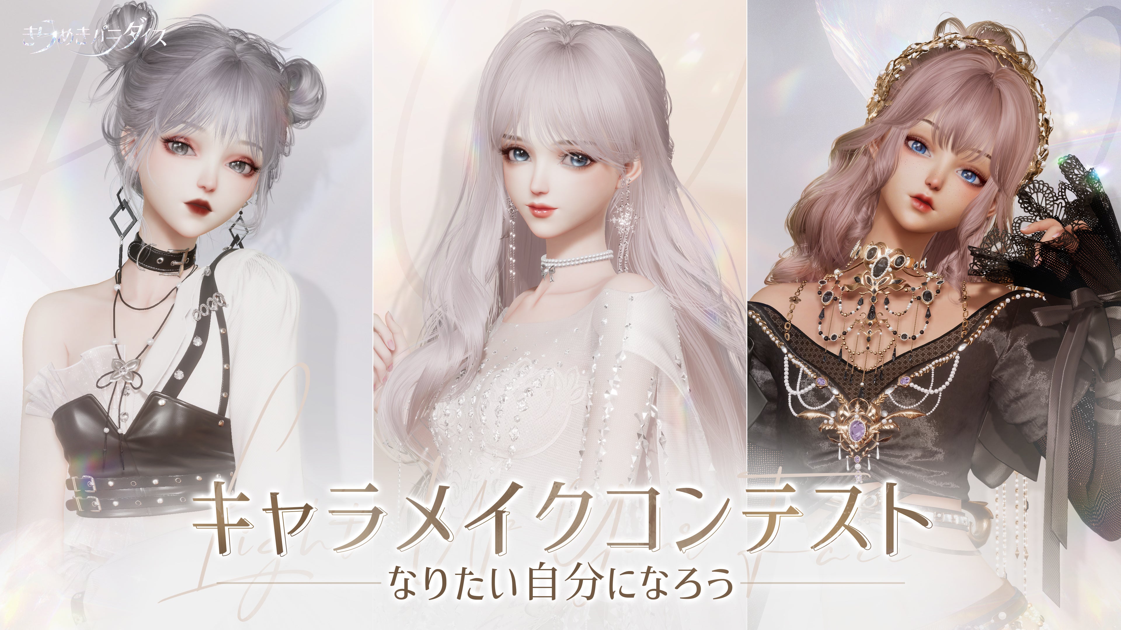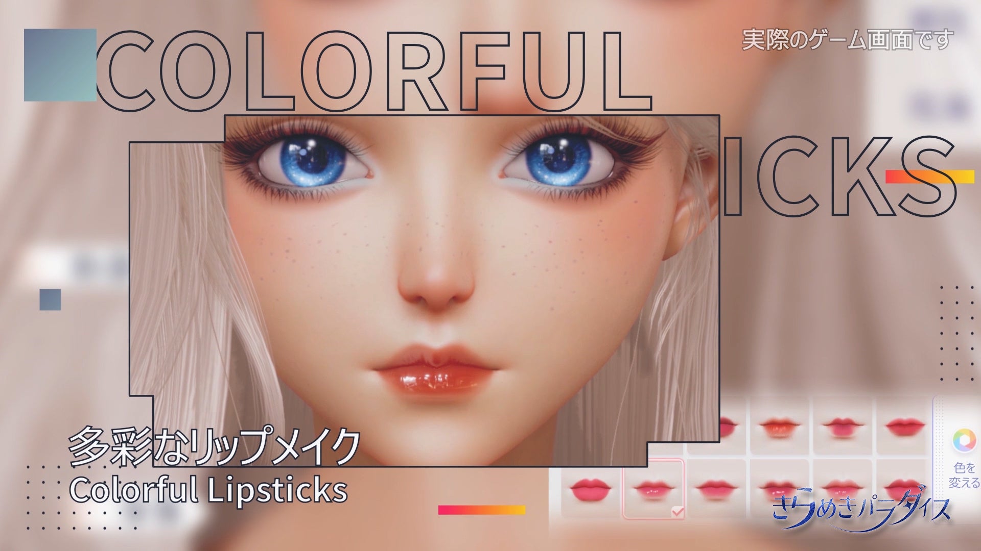 『きらめきパラダイス』では、特徴である自由度の高いキャラメイクシステムを利用して、理想の自分を思うままに表現できます。