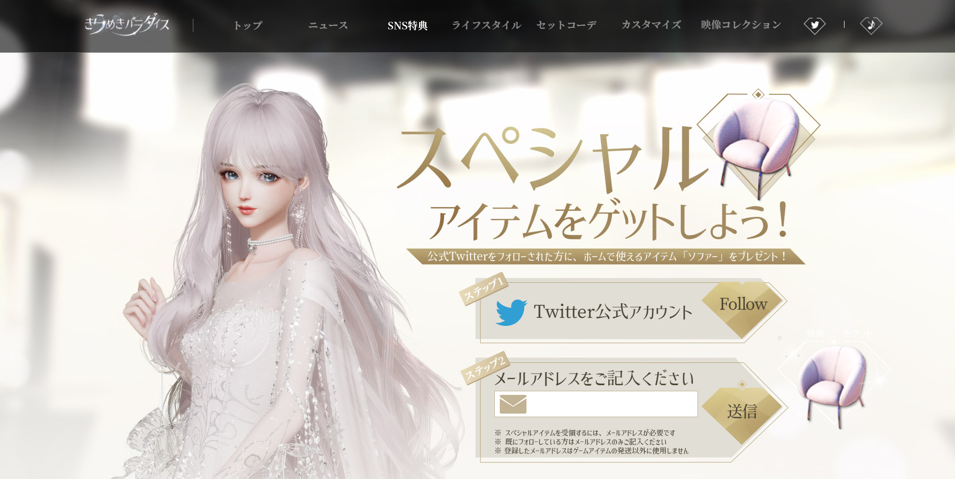 『きらめきパラダイス』は現在SNSでの早期特典イベントが開催しています。早期特典イベントへの参加が完了すると、ゲーム内のホーム画面で使えるアイテムの「ソファー」を獲得できます。