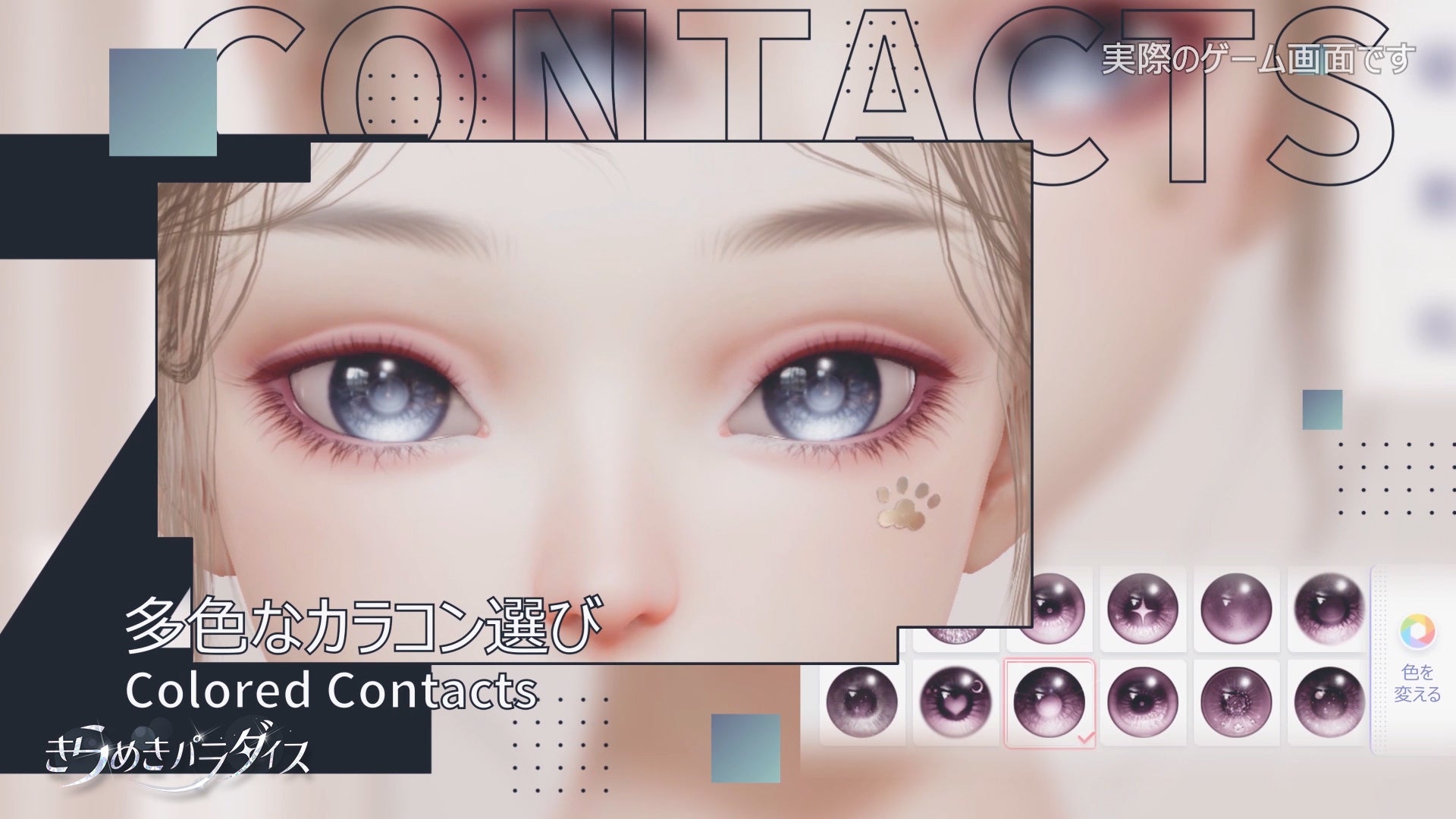 瞳は”憧れの自分”に近づくため、また、魅力をさらにプラスする重要なアイテム。本作では、あなたの魅力を引き出すため、さまざまな種類のカラコンを用意しています。
