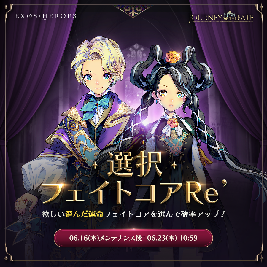 開催期間中は、「歪んだ運命」テーマのフェイトコアである「ブルンの小さな女帝_キャリー」、「継承者_ジョン・ドンク」を始めブラックフェイトコアの「行き場を失った狼_マハル」、「黒狼_バラール」、「守護の弾丸_ザリエンヌ」、「煮えたぎる口_ネロ」の6体の内、選択した1体が通常より高い確率で獲得することができます。