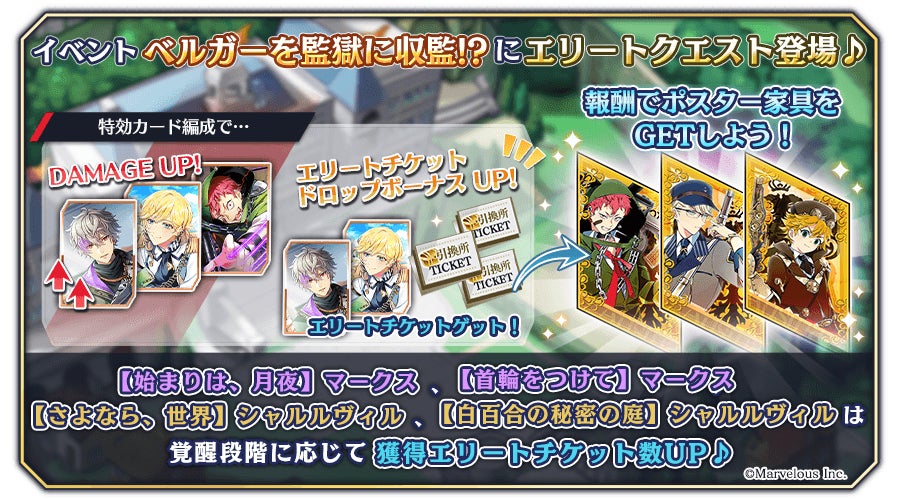 イベント「ベルガーを監獄に収監!?」にエリートクエストが追加!エリートクエストではここでしか手に入らないポスターも登場♪スタンプの他にも、引換所ではローズストーンやスキップチケットも手に入ります♪