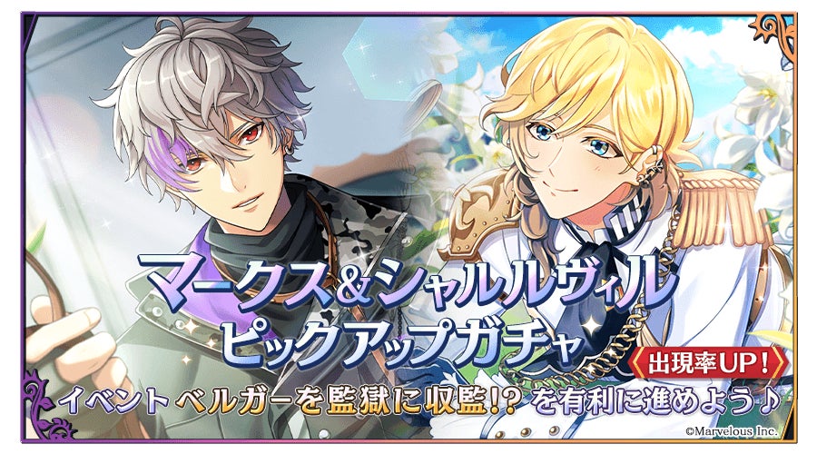 株式会社マーベラス(代表取締役社長 許田周一/所在地:東京都品川区)による、スマートフォンゲーム『千銃士:Rhodoknight』(読み:せんじゅうし ろーどないと 以降、『千銃士R』)は、6月13日より開催中のイベント「ベルガーを監獄に収監!?」にあわせて、イベント内で活躍する★3のマークス(CV:熊谷健太郎)とシャルルヴィル(CV:立花慎之介)のカードがピックアップで登場する期間限定ガチャを開催いたします。