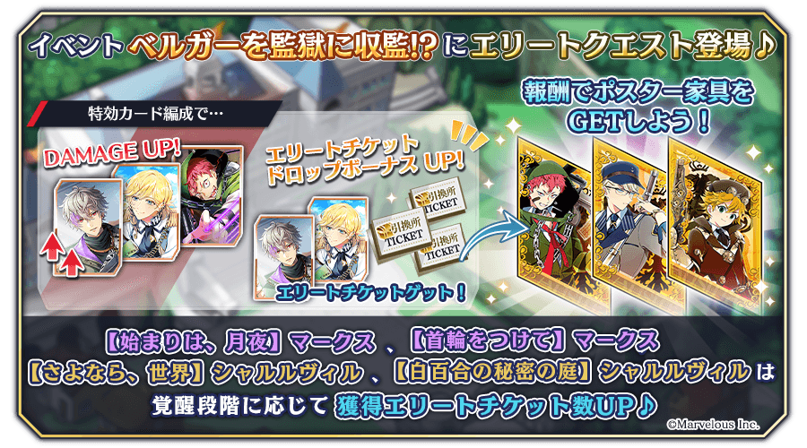 イベント「ベルガーを監獄に収監!?」にエリートクエストが追加!エリートクエストではここでしか手に入らないポスターも登場♪スタンプの他にも、引換所ではローズストーンやスキップチケットも手に入ります♪