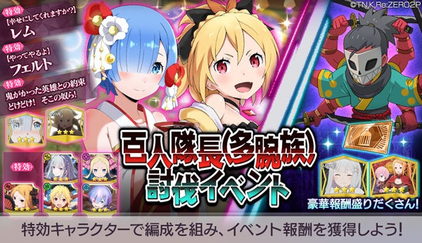 株式会社セガは、配信中の人気テレビアニメ「Re:ゼロから始める異世界生活」公式スマートフォン向けゲーム『Re:ゼロから始める異世界生活 Lost in Memories(以下、『リゼロス』)』にて、本日より「百人隊長(多腕族)討伐イベント」を開催します。