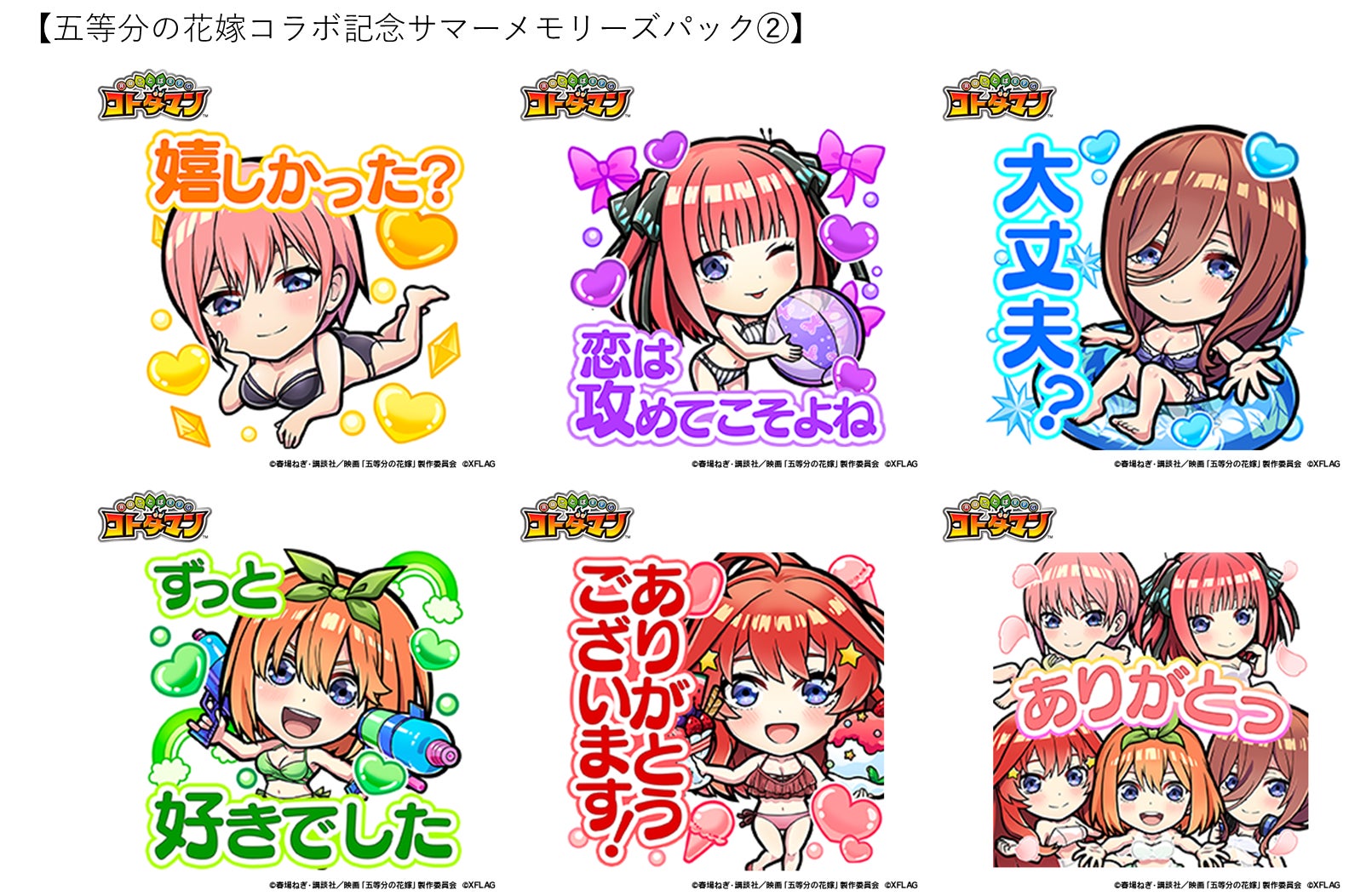 虹のコトダマ1,000個に、マルチプレイで使用できる映画「五等分の花嫁」に登場する五つ子の台詞を収録したコラボスタンプ(ボイス付)がおまけでつくパックを販売します。おまけのスタンプは、五つ子の「浴衣姿」と五つ子集合の「パジャマ姿」のセット(6個)と、五つ子の「水着姿」と五つ子集合の「水着姿」セット(6個)の2種類があります。