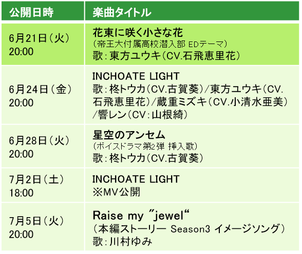 歌:柊トウカ(CV.古賀葵)東方ユウキ(CV.石飛恵里花)蔵重ミズキ(CV.小清水亜美)響レン(CV:山根綺)