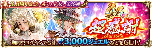 期間中、最大14日間ログインで3,000ジュエルと3.5周年記念-赤の少女-スタミナ回復剤(小)[期間限定] ×140をプレゼントいたします。