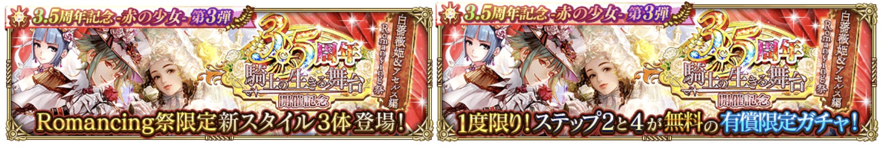 新ガチャ「3.5周年記念 Romancing祭 白薔薇姫&アセルス編」を開催いたします。
