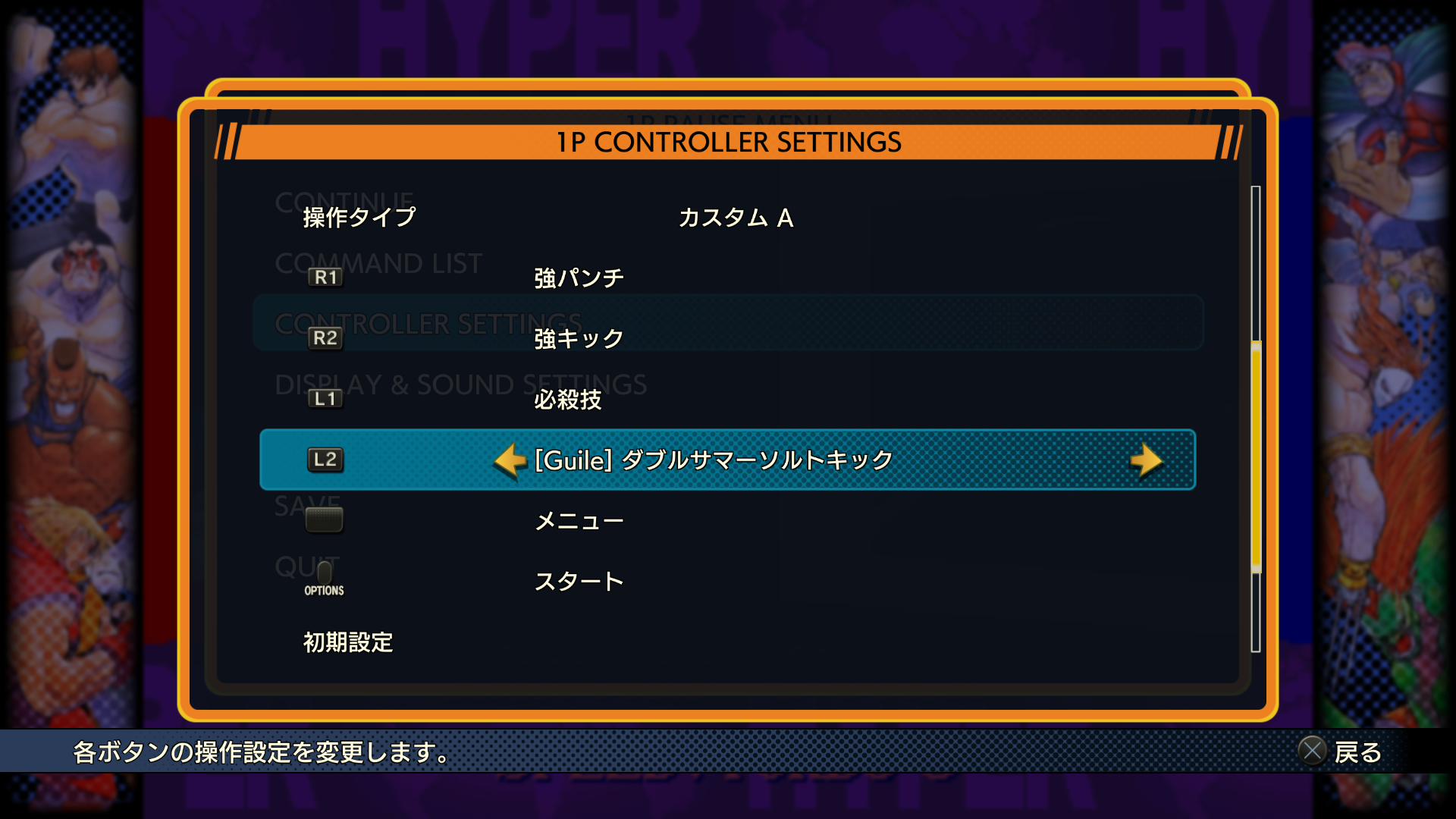 ボタン配置をカスタマイズして、戦いやすい設定にしよう。コマンド入力が難しいと思うプレイヤーはワンボタンで必殺技が出るように設定することも可能だ。